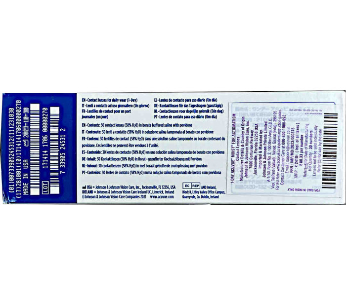 Made by Johnson and Johnson in USA and Ireland factories, Acuvue Moist Astigmatism uses BLINK STABLIZED Design giving stable vision ,exceptional comfort with LACERON Technology and UV Protection